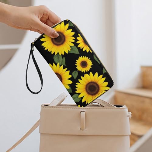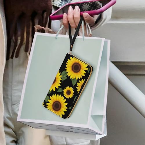 HOT ! PU Leather Wallet for Women, Waterproof Card Holder Organizer Wallet Floral Black Yellow Flowers Sunflower Travel Long Zipper Clutch Purse