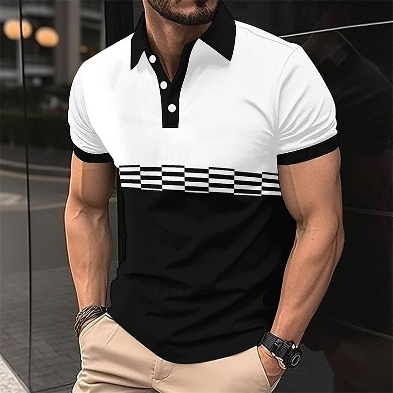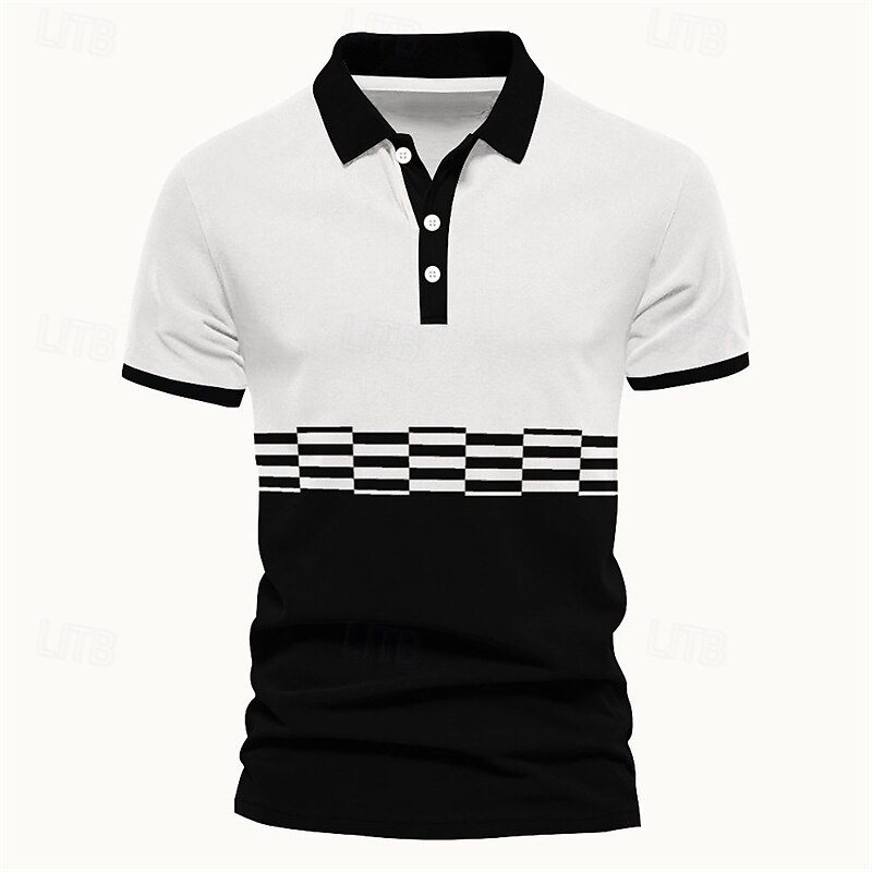 Men's Polo Button Up Polos Casual Sports Lapel Short Sleeve Fashion Basic Plaid Color Block Buttons Summer Spring Black Black White Polo 1