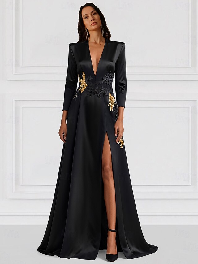 More information about Tuxedo Dress A-Line Formal Wedding Wedding Guest Satin Elegant Silky Long Sleeve Floor Length Split Thigh V Neck