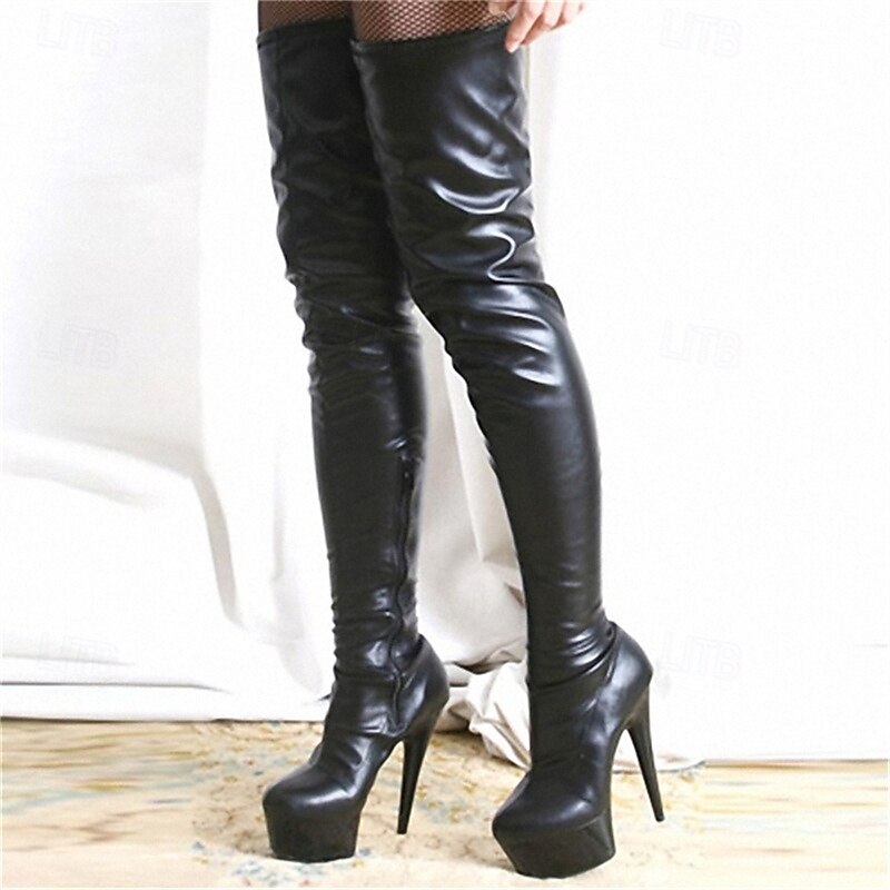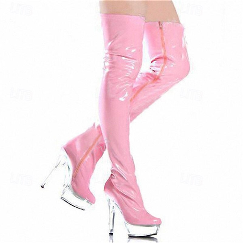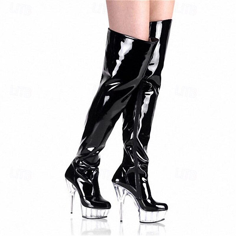 HOT ! Women's Black Faux Patent Leather Thigh High Boots – Platform Stiletto Over-the-Knee Boots for Clubwear, Night Out, and Performance