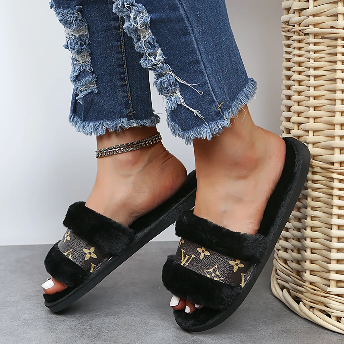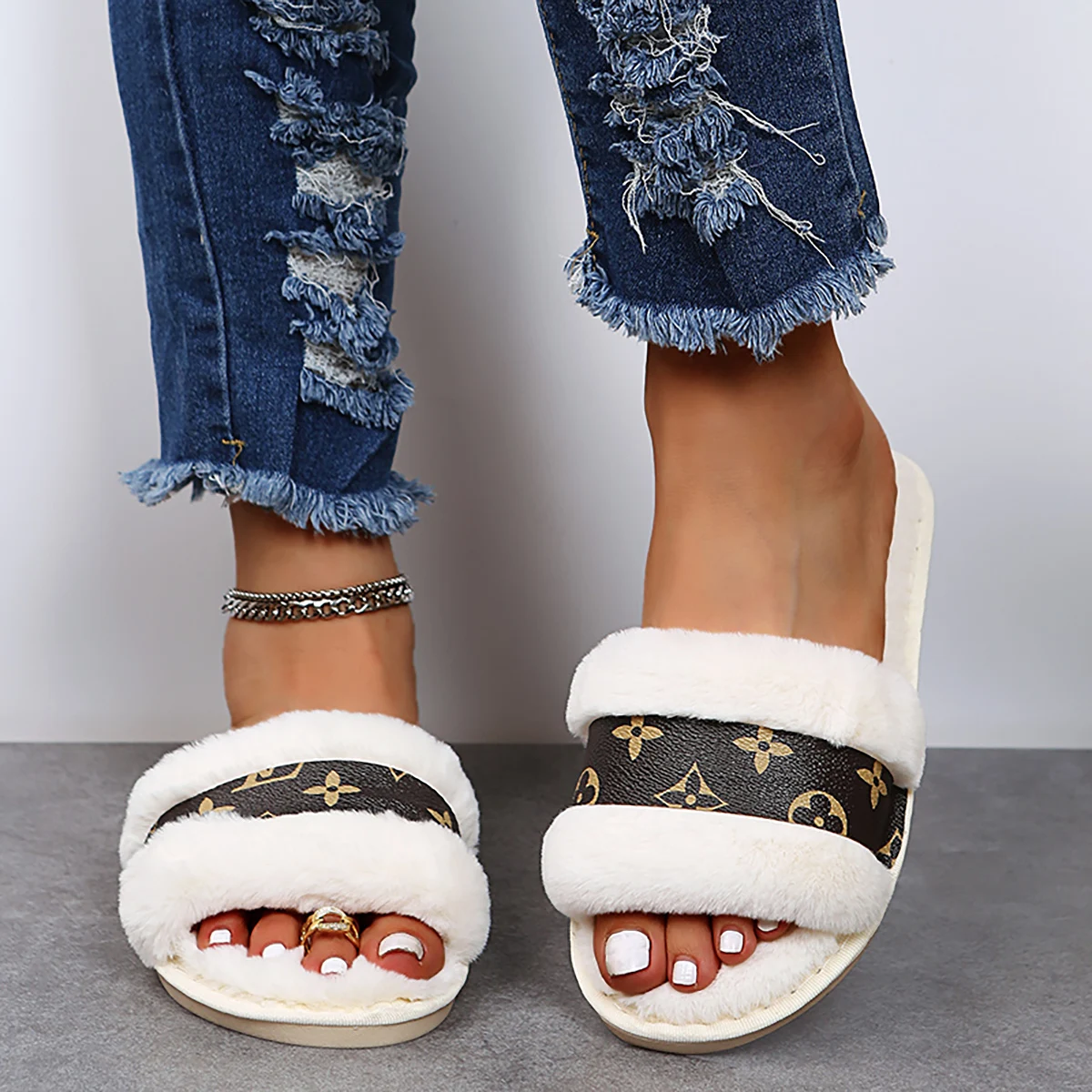 SpecificationsApplicable Place: Indoor/outdoorChoice: yesHeel Height: Flat (��1cm)Heel Type: Flat?Sole Material: RubberShoes Type: Flip FlopsUpper Material: Faux Fur?