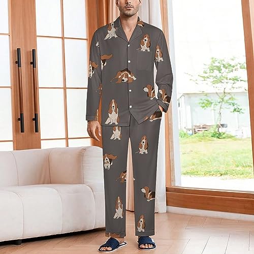 Basset Hound Dog Mens Pajamas Set Long Sleeve Button Down Top and Pants Sleepwear 1