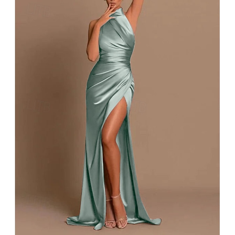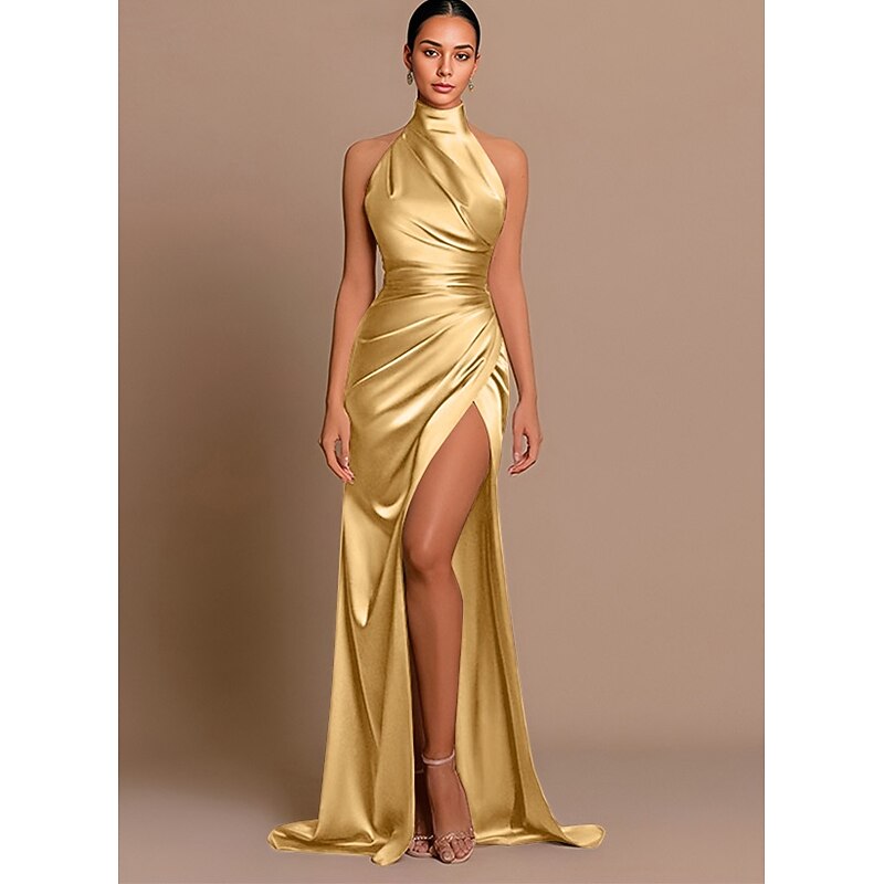 More information about Beach Wedding Mermaid Evening Gown High Split Dress Wedding Wedding Guest Sweep / Brush Train Sleeveless Halter Neck Bridesmaid Dress Charmeuse with Pleats Masquerade Dress
