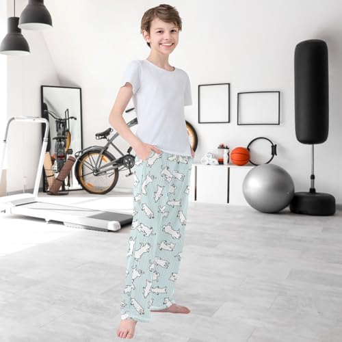 HOT ! Boy's Pj Pants Dog Lying Green White Striped Lounge Bottoms Elastic Waist Kids Joggers with Pockets Size 6-14