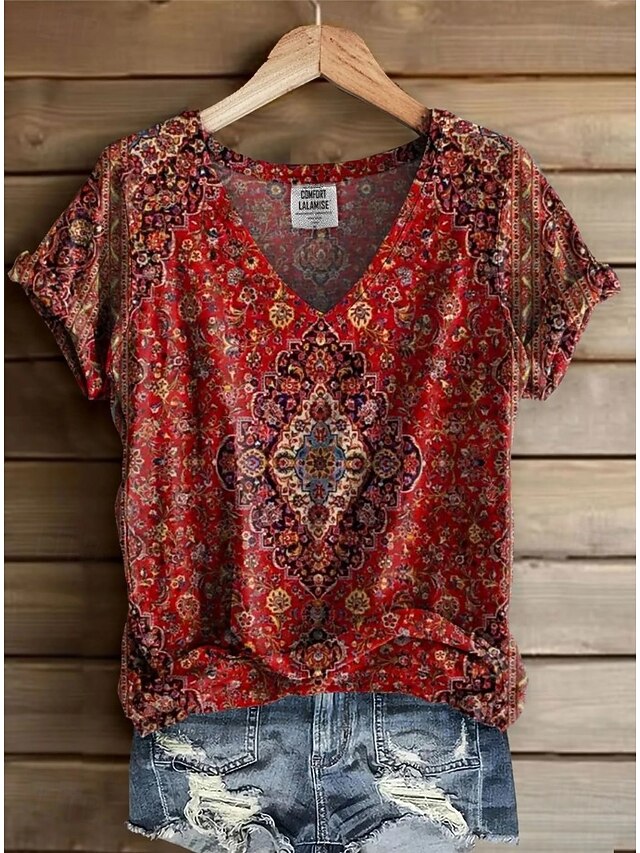 More information about Women's T Shirt Floral Graphic Paisley Bohemia Vintage Stylish Short Sleeve V Neck Regular Tops Daily Going out Weekend Print Red Light Brown Green off-white Summer Spring