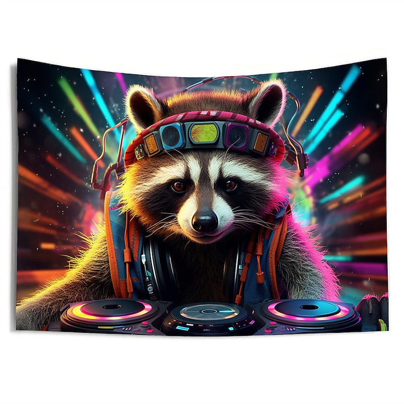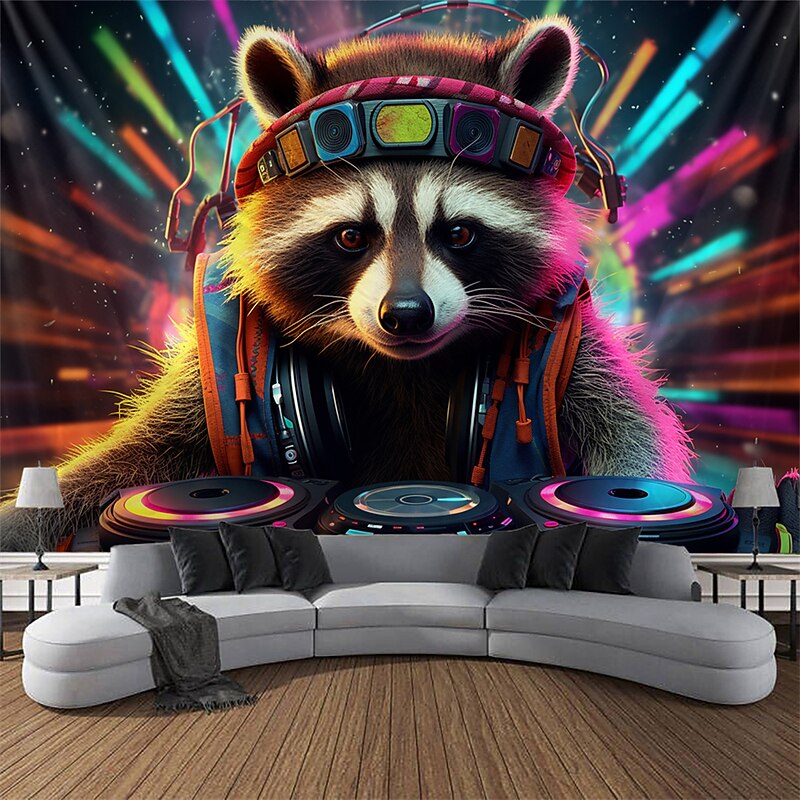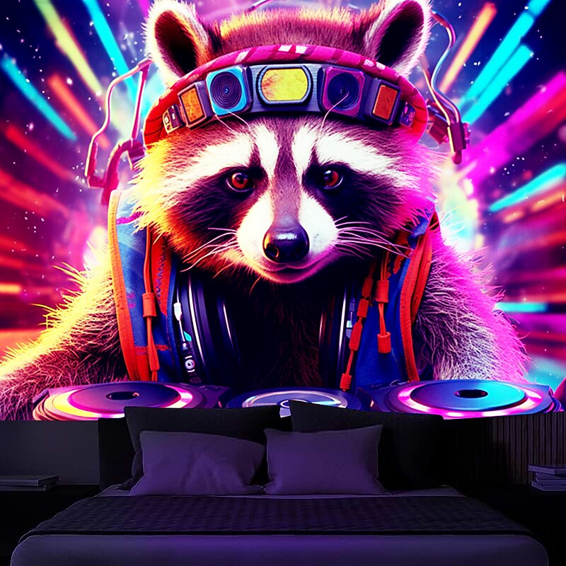Blacklight Tapestry UV Reactive Glow in the Dark Glow Party Neon Trippy Misty DJ Raccoon Animal Hanging Tapestry Wall Art Mural for Living Room Bedroom