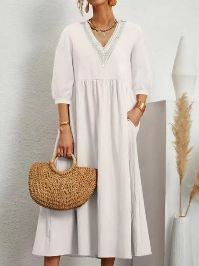 HOT ! Women's Midi Dress Cotton Linen Dresses Casual Dress Basic Casual Vacation Daily Regular Fit Plain 3/4 Length Sleeve V Neck Black White Army Green Summer