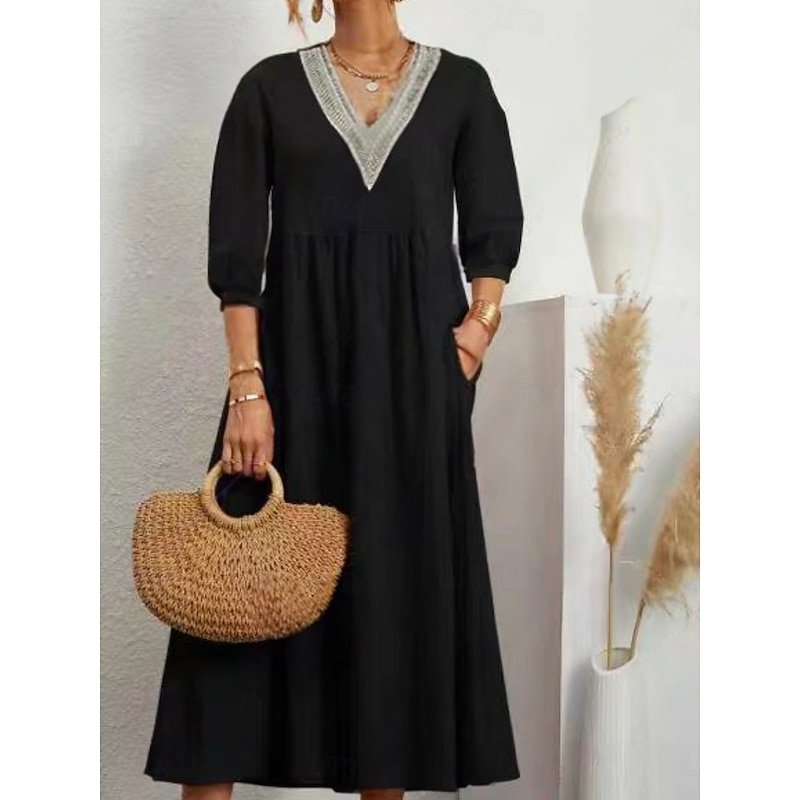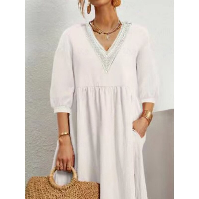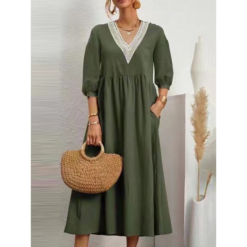 More information about Women's Midi Dress Cotton Linen Dresses Casual Dress Basic Casual Vacation Daily Regular Fit Plain 3/4 Length Sleeve V Neck Black White Army Green Summer