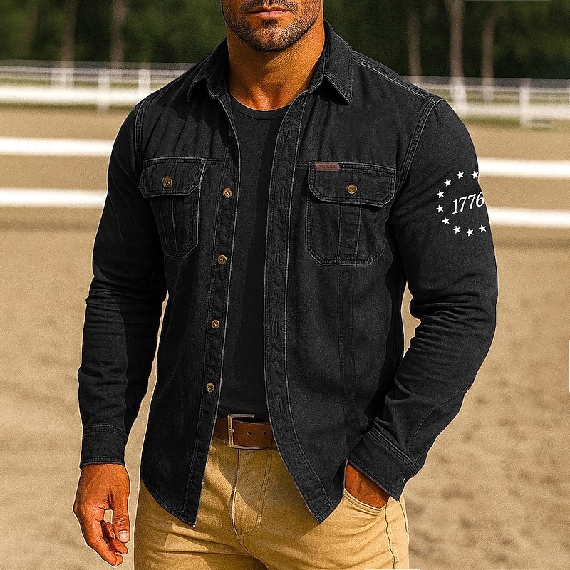 HOT ! Men's Patriotic 1776 Work Shirt Western Shirt Cargo Shirt Long Sleeve Tactical Vintage Retro Sports Outdoor WorkWear Spring Fall Turndown Front Two Pockets Button Up Shirts Black Red Blue Orange Khaki