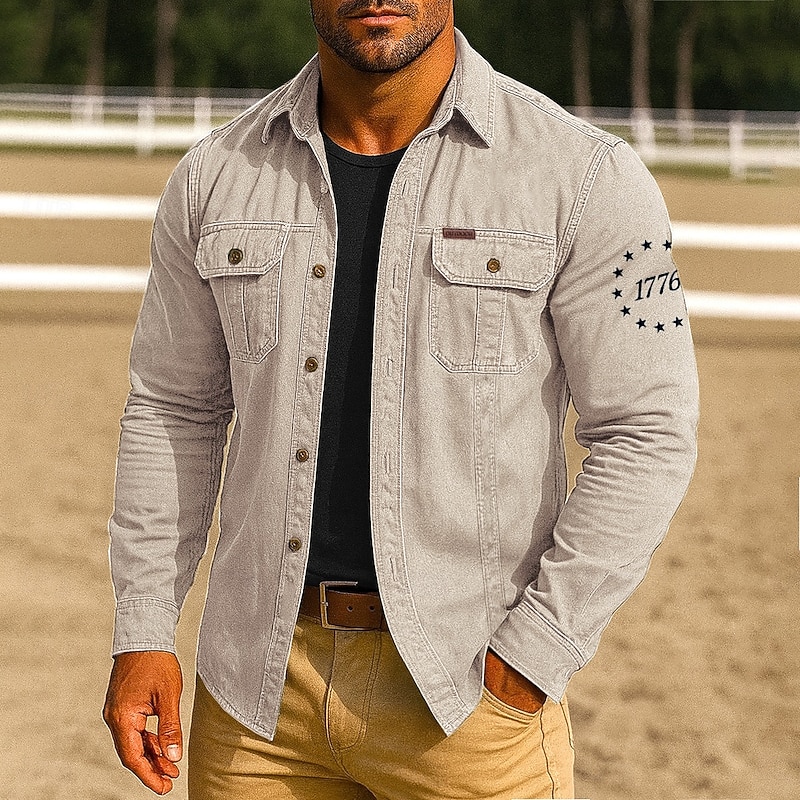 Men's Patriotic 1776 Work Shirt Western Shirt Cargo Shirt Long Sleeve Tactical Vintage Retro Sports Outdoor WorkWear Spring Fall Turndown Front Two Pockets Button Up Shirts Black Red Blue Orange Khaki 1