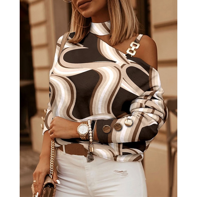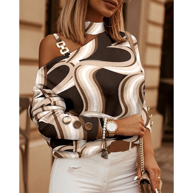 More information about Women's Shirt Blouse Streetwear Geometric Cut Out Print Cold Shoulder Long Sleeve Regular Tops Turtleneck High Neck Party Casual Going out Black Navy Blue Brown Khaki Spring Fall