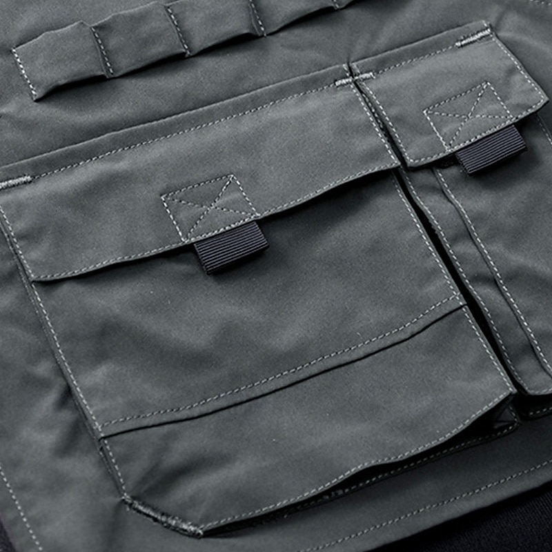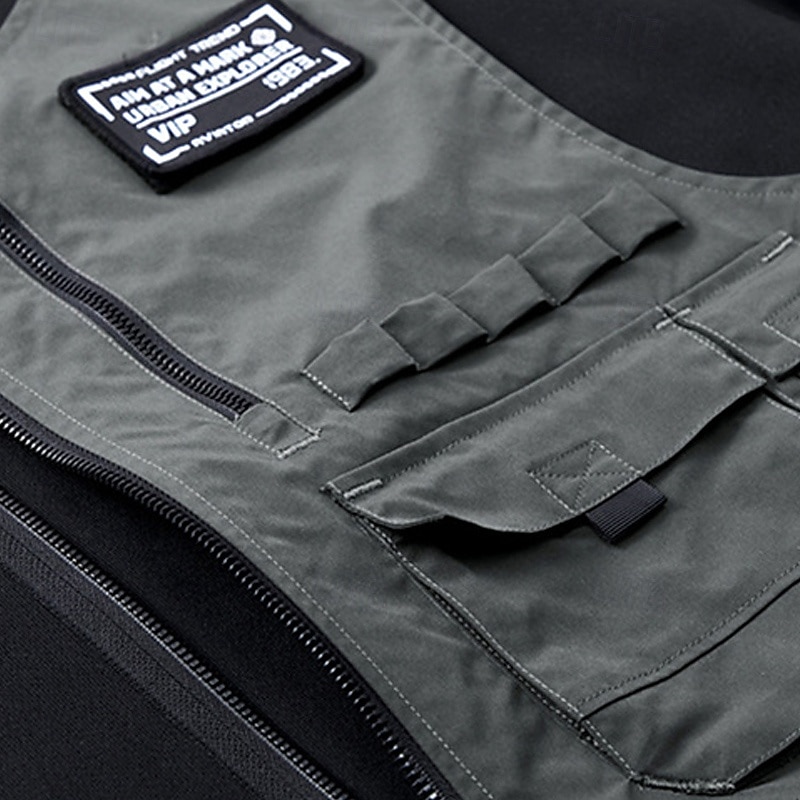 : This sweatshirt stands out with its color block patchwork design and functional zipper elements. The distinctive feature is the asymmetrical vest overlay, constructed from a lightweight gray material, adding a modern, utilitarian touch. Several pockets with flaps and zippers provide ample space for carrying essentials, merging style with practicality.