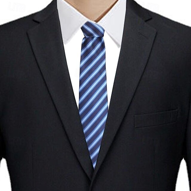 Highlights [Fabric] : Crafted from high-quality Terylene, this men's narrow stripe tie combines both elegance and durability, making it ideal for regular wear. The fabric's texture ensures a smooth finish, adding a sophisticated touch to any outfit. [Silhouette] : The 8cm width of the tie offers a classic silhouette that works well with most shirt collars. Its arrow design complements both slim and standard suits, providing a balanced and polished appearance. [Design Highlights] : This tie features a refined stripe pattern in shades of blue, offering a subtle yet striking accent that enhances both formal and semi-formal ensembles. Its classic design ensures it remains a versatile addition to any wardrobe. [Occasions] : Perfect for a variety of occasions, this tie is suitable for formal evenings, business meetings, dates, parties, and festive gatherings. It provides a refined touch to your ensemble, ensuring you look well-dressed and stylish in any setting. [Size Range] : Available in one size with an 8cm width, this tie is designed to fit most men comfortably and can be paired with a wide range of shirt and suit styles for maximum versatility and appeal.