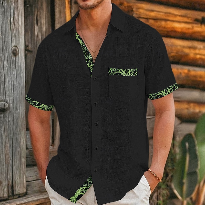 More information about Men's Shirt Linen Shirt Viking Style Summer Shirt Beach Wear Button Up Shirt Solid Color Vacation Curise Black White Pink Khaki Short Sleeve Collar Summer Spring & Summer Clothing Apparel Patchwork
