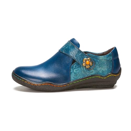 Superladystar's Women Comfy Cowhide Hand Made Flat Shoes, Coloring Painted, Hand Embossed, Retro Style, Walk Shoes 6