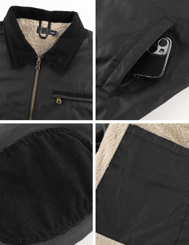 • Thick Sherpa Fleece Lined: Mens jacket features thermal sherpa fleece lining, which quickly traps heat while delivering a soft touch and strong insulation. Corduroy-trimmed collar, the comfortable, non-bulking lining allows full range of motion, while the dense fleece won’t shed and stays plush wash after repeated washes