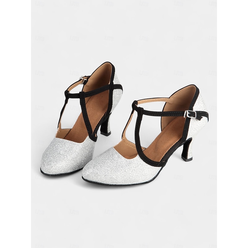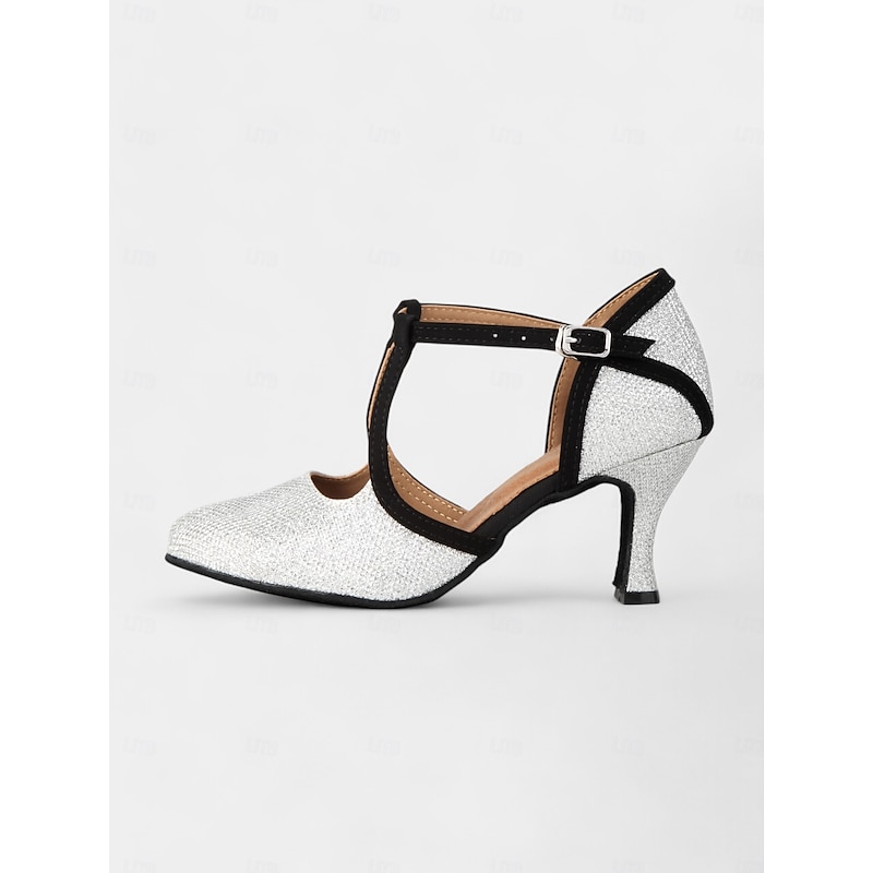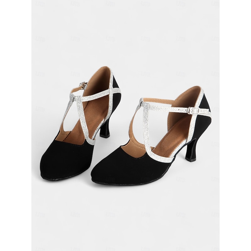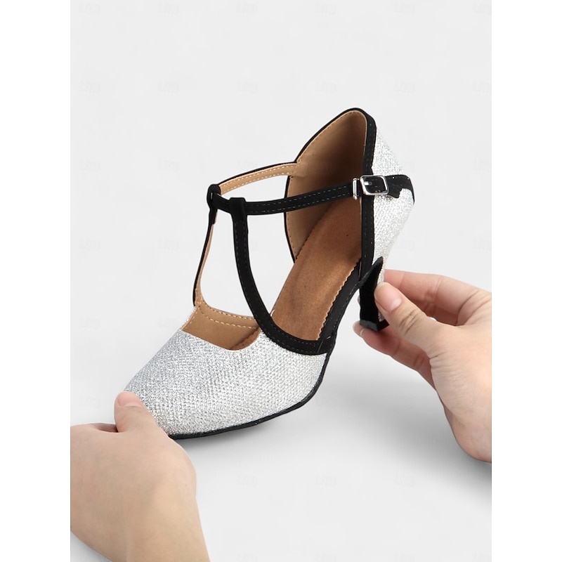 Highlights [Fabric and Material] : Crafted from high-quality PU leather, these Latin dance shoes feature a soft suede sole that ensures both durability and a luxurious feel. The upper material provides a sleek look while offering comfort for extended wear. [Style and Fit] : Designed with an open toe and a classic T-strap, these shoes combine elegance and functionality. The adjustable ankle buckle ensures a secure, personalized fit, and the mid-height flare heel of approximately 2 inches (5 cm) offers the perfect balance of comfort and lift. [Design Highlights] : Featuring a silver glitter strap, these dance shoes sparkle with every move. The timeless black design is complemented by subtle yet sophisticated accents, making them a standout choice for the dance floor. [Occasions] : Perfect for a variety of dances such as Samba, ChaCha, and Rumba, these shoes are suitable for both practice sessions and performances. Whether for a formal event or an evening out, they effortlessly blend style and practicality. [Size Range] : Available in a wide range of sizes from US5 to US10 (EU35 to EU42, UK3 to UK8), these shoes are designed to fit standard sizing, allowing you to select your usual size with confidence.