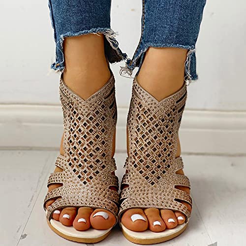 Womens Sandals Heels Low, Women's Hollowed Out Wedge Sandals Open Toe Casual Zipper Sandals Beach Summer Rhinestone Sandals 6