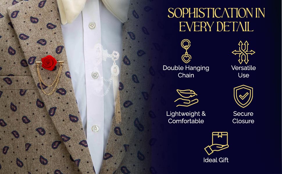 Knighthood Brooch Pin Red Rose with Double Hanging Chain Brooch Suit Stud Lapel Pin 4