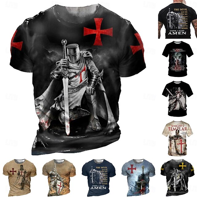 Men's Templar Cross Graphic Prints Soldier T Shirt Christian T Shirts Short Sleeve T shirt 3D Print Crew Neck Shirt Vintage Sports Designer Outdoor Street Daily Black / Gray Black+Black Black 1 Summer 8