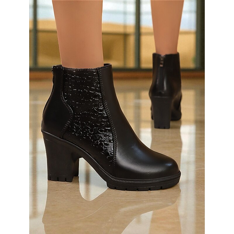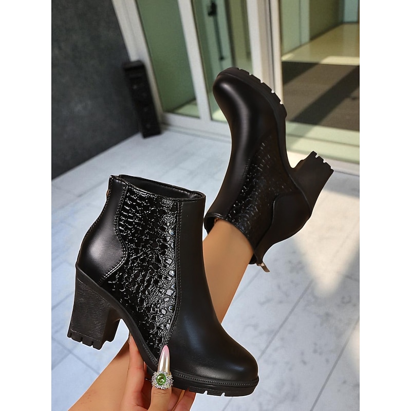 Women's Burgundy Faux Leather Ankle Boots with Block Heels and Croc Texture - Elegant Fall Office & Casual Wear Booties 1