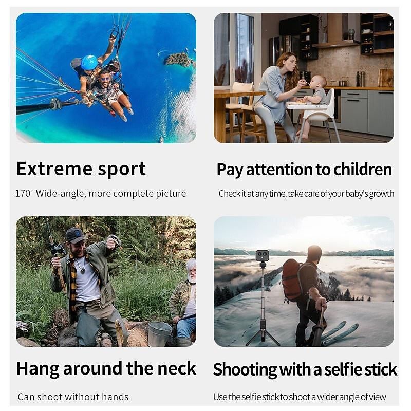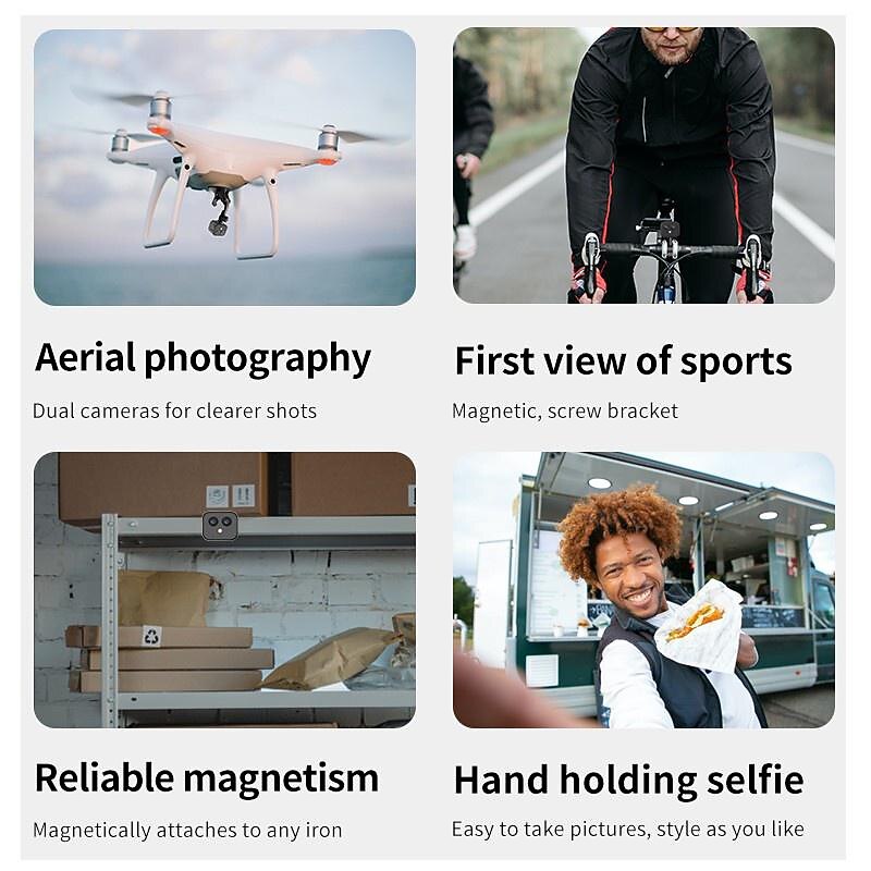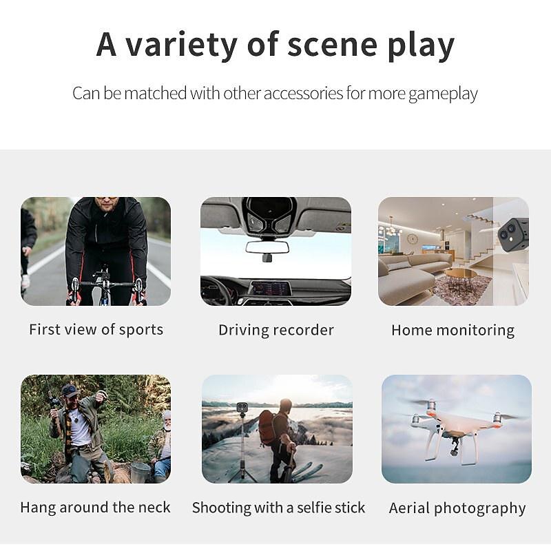 Cycling and motorcycle riding, outdoor extreme sports skydiving and jumping on the helmet, aerial camera, driving recorder, store monitoring, warehouse video, real-time babysitting for the elderly (using mobile phones to remotely check the status of children and elderly at home when not at home) Family living room room Monitoring, corridor monitoring, home door monitoring, office, travel, conference, classroom, pet care, can be magnetically attached to refrigerators, warehouse iron shelves, and other iron products