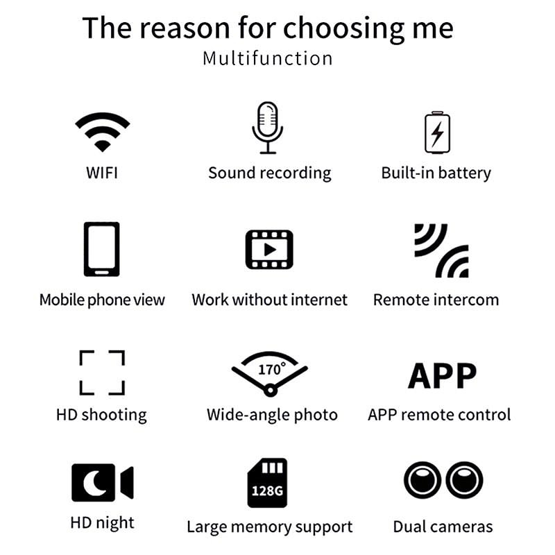 Photo, video, recording, voice intercom, global Wi-Fi remote mobile phone (any brand) tablet can be monitored, remote control LED night vision light to turn on, power failure can be powered by a power bank or socket, or with its own battery to continue recording, cut off Power recording, magnetic body, built-in hotspot connection, disconnected video recording, support 128G memory card and APP to save photos and videos to mobile phones