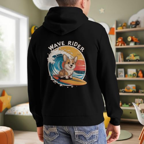 Kids Vintage Corgi Surfing on the magnificent Waves off Kanagawa Boys Girls Lightweight Kangaroo Pocket Fleece Hoodies