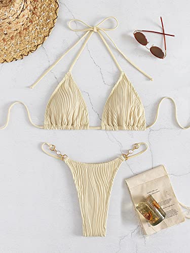 • Feature: Halter Neck, Tie Back, Padded Bikini Top, Pearl Bead, Low Rise Thong, Thong Bikini,Sexy Bikini Sets for Women