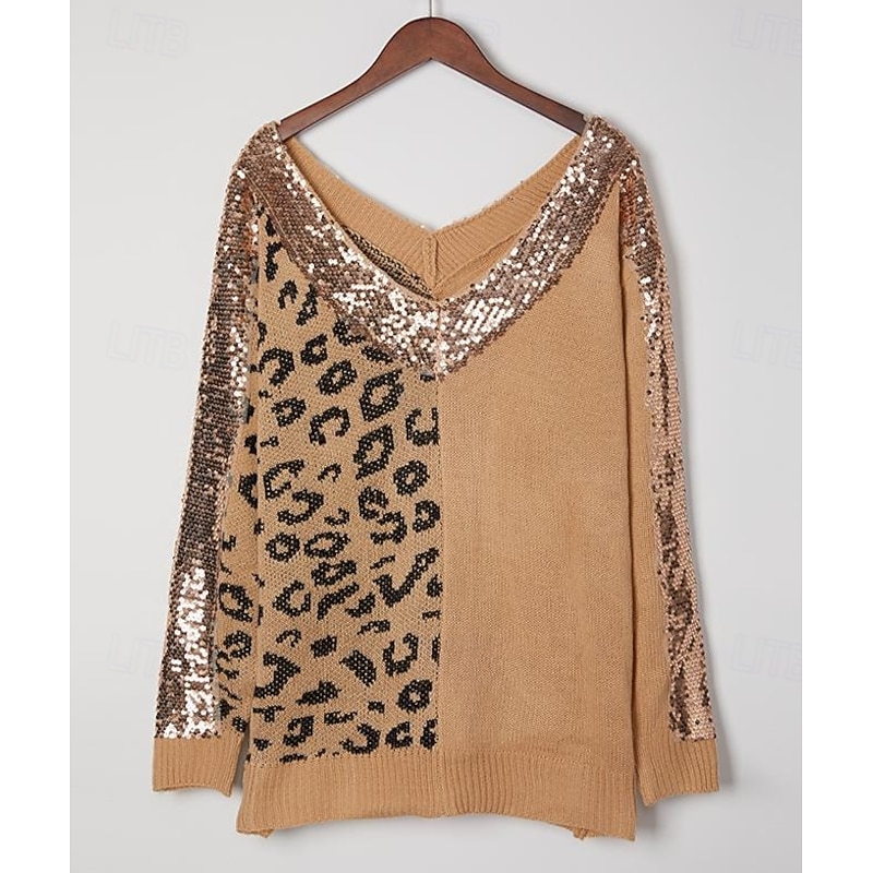 Highlights [Fabric] : Crafted from a soft polyester blend, this sweater offers a comfortable and cozy feel, ideal for fall and winter. The micro-elastic knit material ensures a flexible fit, while the ribbed knit style adds texture and visual interest. [Cut] : This women's sweater features a regular fit with a regular length, designed to drape elegantly on the body. The V-neckline and long sleeves provide a classic yet stylish look, perfect for layering during cooler months. [Design Details] : The sweater stands out with its unique combination of leopard print and solid pink or camel sections. Sequined panels on the sleeves and neckline add a touch of glamour and sparkle, transforming this piece into a statement sweater that seamlessly blends style with comfort. [Occasions] : Versatile and chic, this sweater is suitable for various casual settings including daily outings, relaxing weekends, or outdoor gatherings. It's the perfect choice for those who want to showcase their fashion-forward sensibilities while staying cozy and warm. [Size Range] : Available in sizes S, M, L, XL, and 2XL, this sweater caters to a wide range of body types, providing both comfort and style for different preferences.