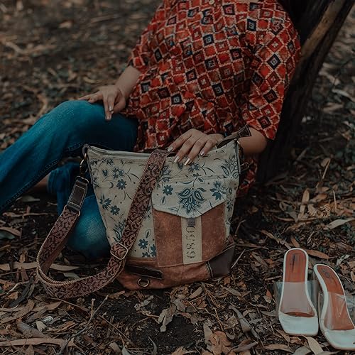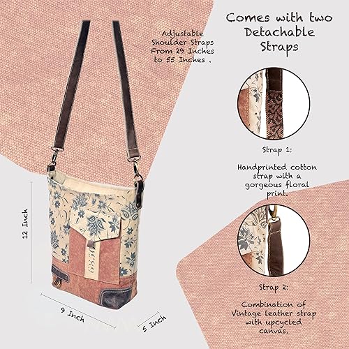 Fabric type: CanvasCare instructions: Spot clean with a damp cloth. Avoid machine washing. Do not iron or dry clean. Keep away from heat sources. Wipe leather parts with a damp cloth and apply leather conditioner periodically. Store in a cool, dry place away from direct sunlight.Origin: ImportedCOMPARTMENTS: Single main compartment with zip closure for easy access to your essentials. Interior featuring one zip pocket, two slip pockets, and a convenient key holder, keeping your belongings neatly organised. Front and back zipper pockets provide additional storage options for quick access to items like your phone, wallet, or keys. Also, a front pocket to store anything that you want to keep handy!PREMIUM HARDWARE: Brass fittings and buckles for timeless elegance and sturdy functionality. YKK zippers with leather zip pullers ensuring smooth and secure closure, adding a touch of sophistication to your everyday carry.DIMENSIONS: Compact yet ample storage with our crossbody canvas bag, featuring dimensions of 12 inches x 9 inches x 5 inchesEMPOWERING WOMEN: Handcrafted exclusively by skilled women artisans, supporting female craftsmanship and promoting gender equality.TWO STRAPS: Comes with two interchangeable straps—a floral print cotton strap for a fresh look and a vintage leather & upcycled canvas strap for a classic touch. Adjustable from 29 to 59 inches.HANDCRAFTED BAG: Premium canvas and leather construction, crafted for durability, timeless elegance, and rugged charm. Each bag is carefully crafted using hand techniques for a one-of-a-kind and timeless appeal. Perfect for everyday use. top-grade materials and excellent craftsmanship ensure long-lasting durability.