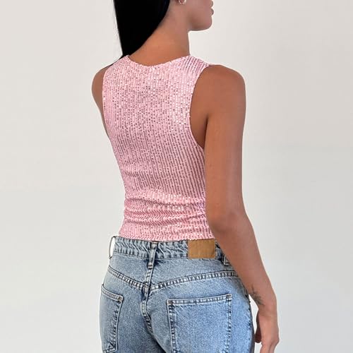 Amiblvowa Sequin Tank Top Women Y2k Sexy Sleeveless Sparkly Crop Camisole Slim Shiny Glitter Cami Going Out Party Vest Shirts