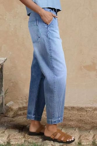 HOT ! Women's Straight Leg Cropped Jeans, Barrel Leg Casual Fit with Mid Rise, Distressed Wash and Stitch Detail, No Belt Needed