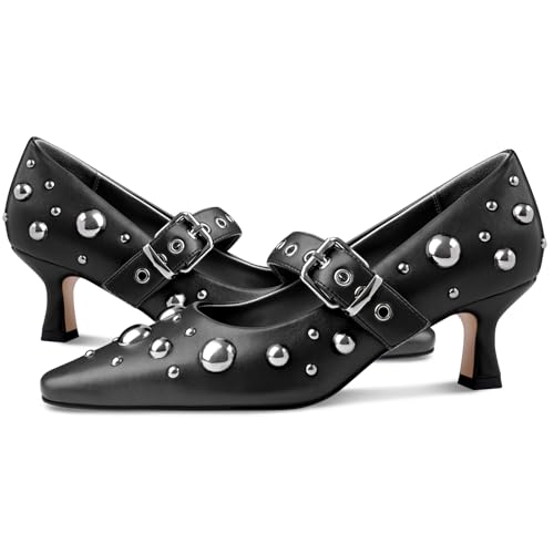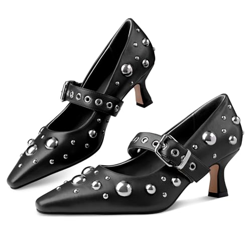 • Chic Design: These stylish heels with rivets blend sophistication with edgy flair and are featured with meticulously placed studs that add a touch of modern elegance to any outfit. The straps are evenly studded with metal eyelets. In addition, the delicate kitten heel and timeless pointed toe also help make a statement whenever you wear these pumps.