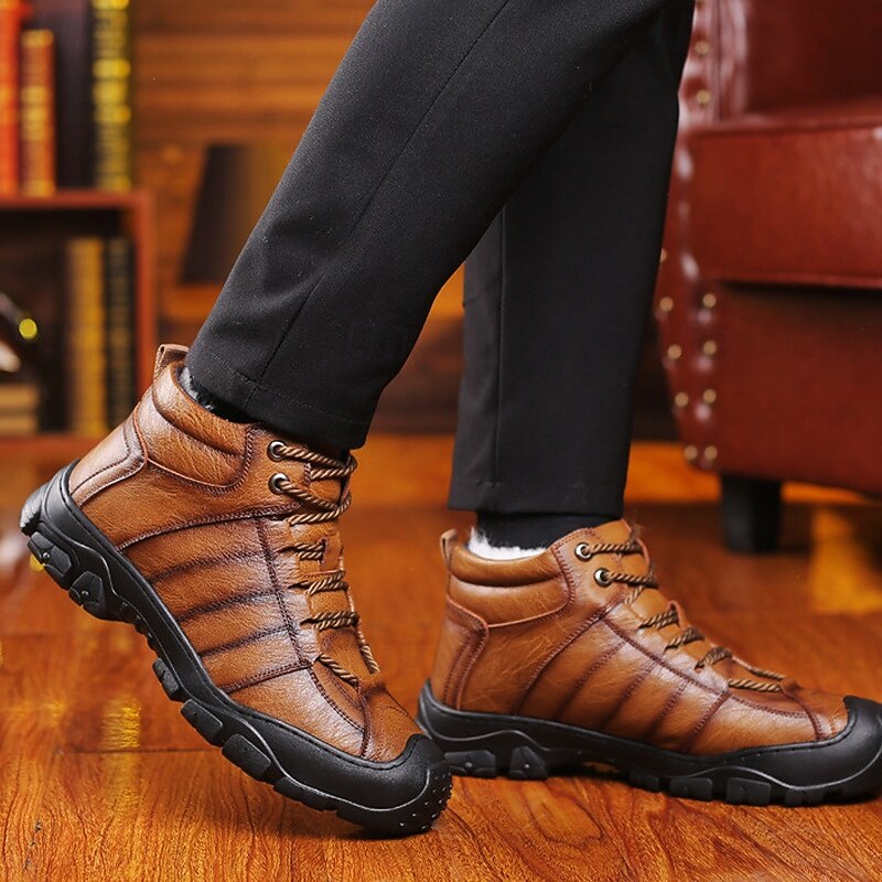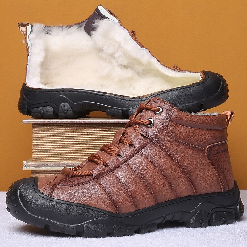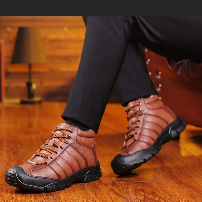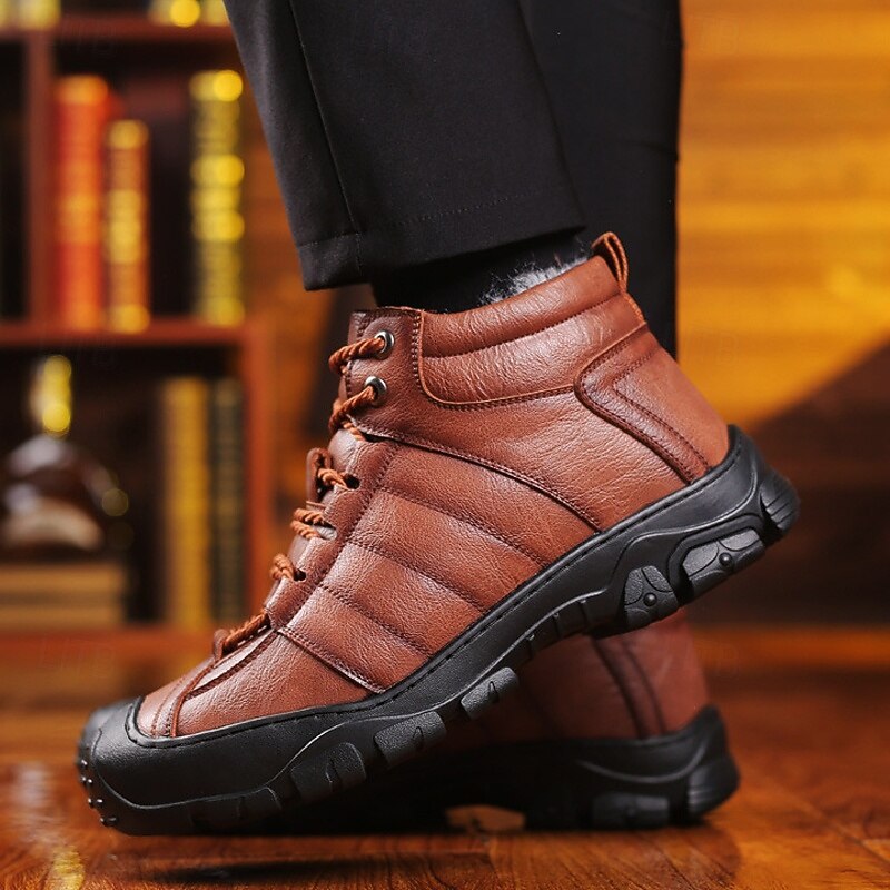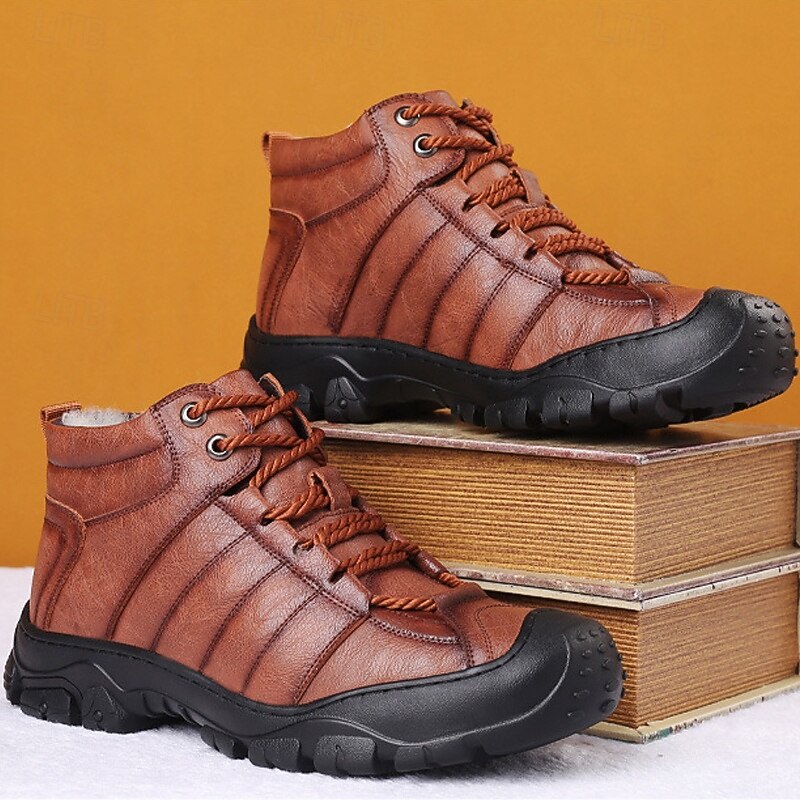 HOT ! Men's Brown Faux Leather Hiking Boots with Plush Lining – Durable Winter Footwear for Outdoor Adventures