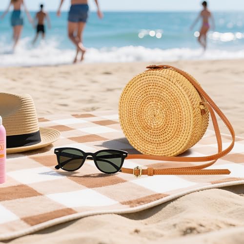 HOT ! Handwoven Round Rattan Purse for Women, Adjustable Leather Shoulder Strap, Boho Straw Beach Bag, Lightweight & Durable for Travel, Wedding, Vacation