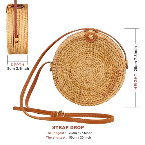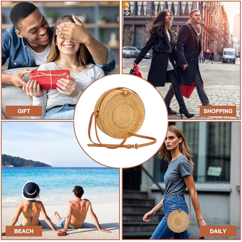 Handwoven Round Rattan Purse for Women, Adjustable Leather Shoulder Strap, Boho Straw Beach Bag, Lightweight & Durable for Travel, Wedding, Vacation 7