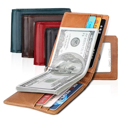 • This slim Minimalist bifold wallet is made of genuine real leather. It has a front ID window that makes it easy to show your ID, a money clip to secure cash & multiple credit card slots. RFID blocking protects your valuable information from unauthorizing scan.