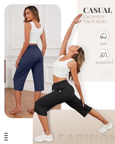 HOT ! Neer 3 Pack Women's Capri Pants, Cotton Wide Leg Basic Sweatpants Lounge Loose Fit Casual Drawstring Yoga Capris with Pockets