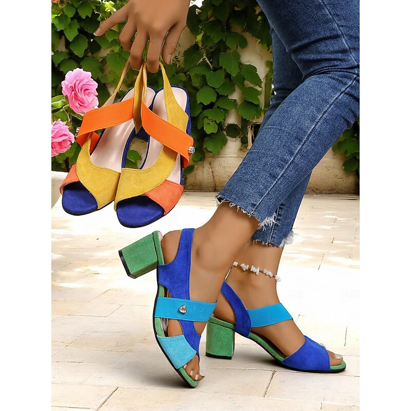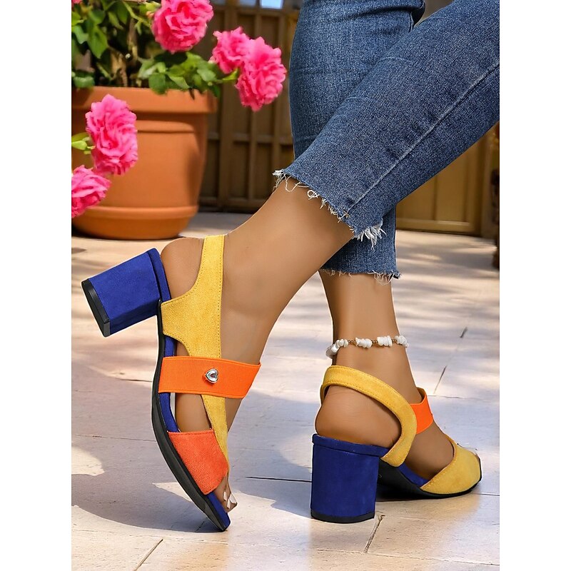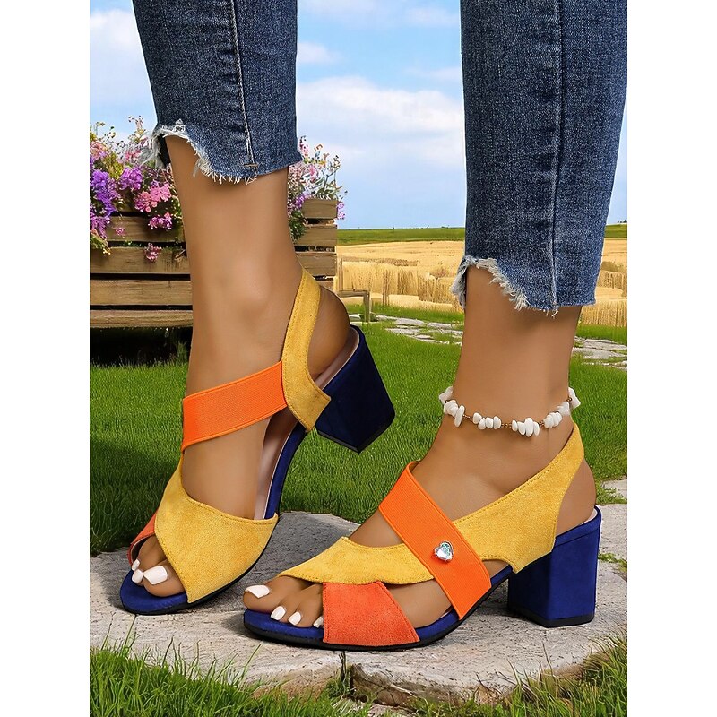 Women's Colorblock Chunky Heel Sandals with Elastic Cross Straps, Artistic Retro Style for Summer Parties, Courtyard Events and Cruise Vacations 2