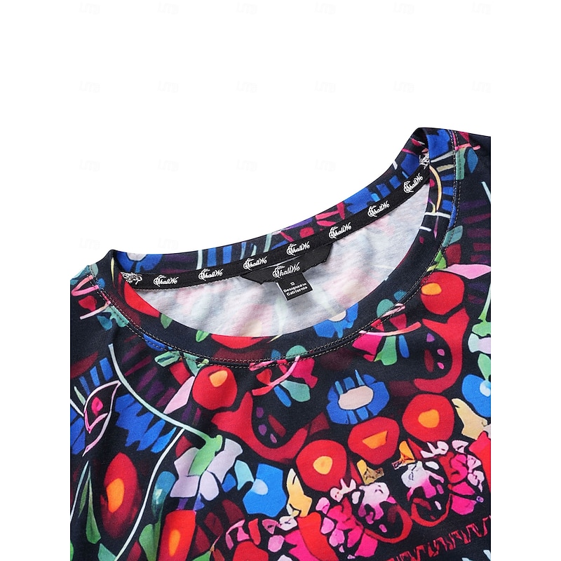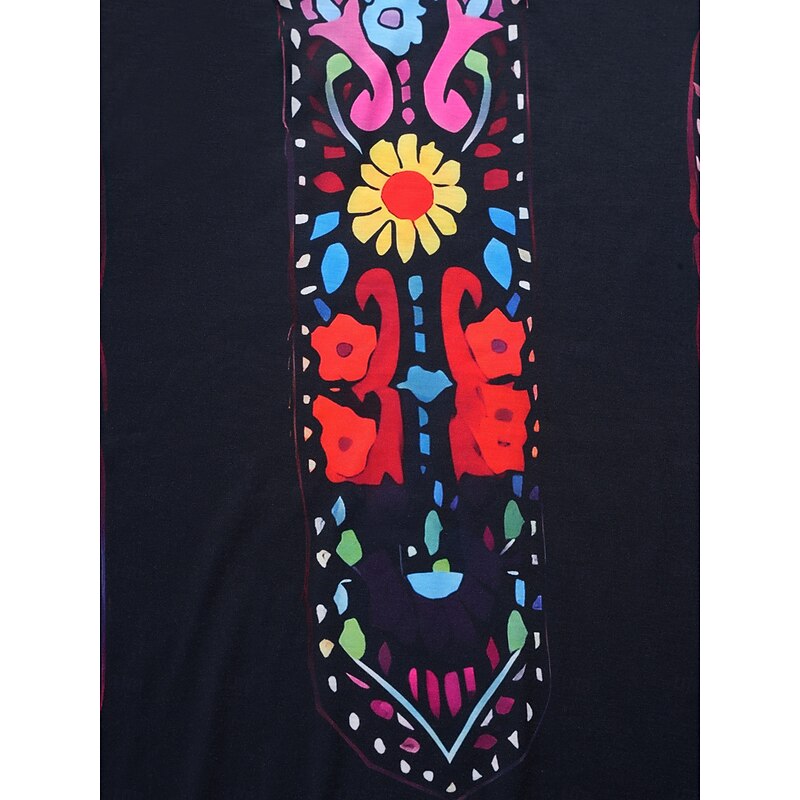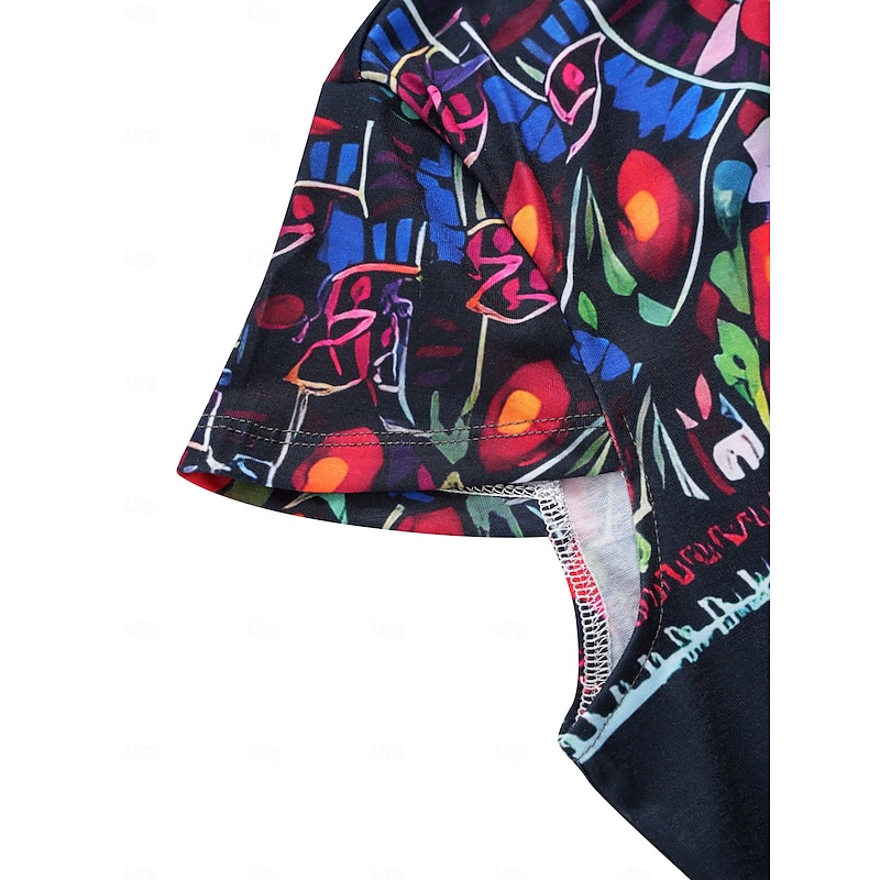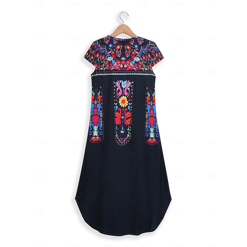 Highlights [Fabric] : Crafted from high-quality polyester, this maxi dress offers a soft and comfortable feel suitable for warm weather. The fabric's micro-elasticity ensures a perfect fit and ease of movement. [Silhouette] : Designed with a regular fit, the dress boasts a relaxed and flowing silhouette, ideal for casual wear. The maxi length adds an element of elegance to its overall appearance. [Design Highlights] : Featuring a split, print, and curved hem, this dress is adorned with intricate floral patterns. The vibrant hues of red, orange, and gold stand out against a deep black background, lending it an exotic and sophisticated flair. The crew neckline and short sleeves add simplicity and elegance, while handy pockets enhance functionality. [Occasions] : Perfect for vacations, this bohemian-style dress is ideal for casual outings or summer adventures. Pair it with sandals or casual footwear for a chic and comfortable summer look. [Size Range] : Available in a variety of sizes from S to XXL, this versatile dress accommodates different body types, ensuring a comfortable fit for everyone.