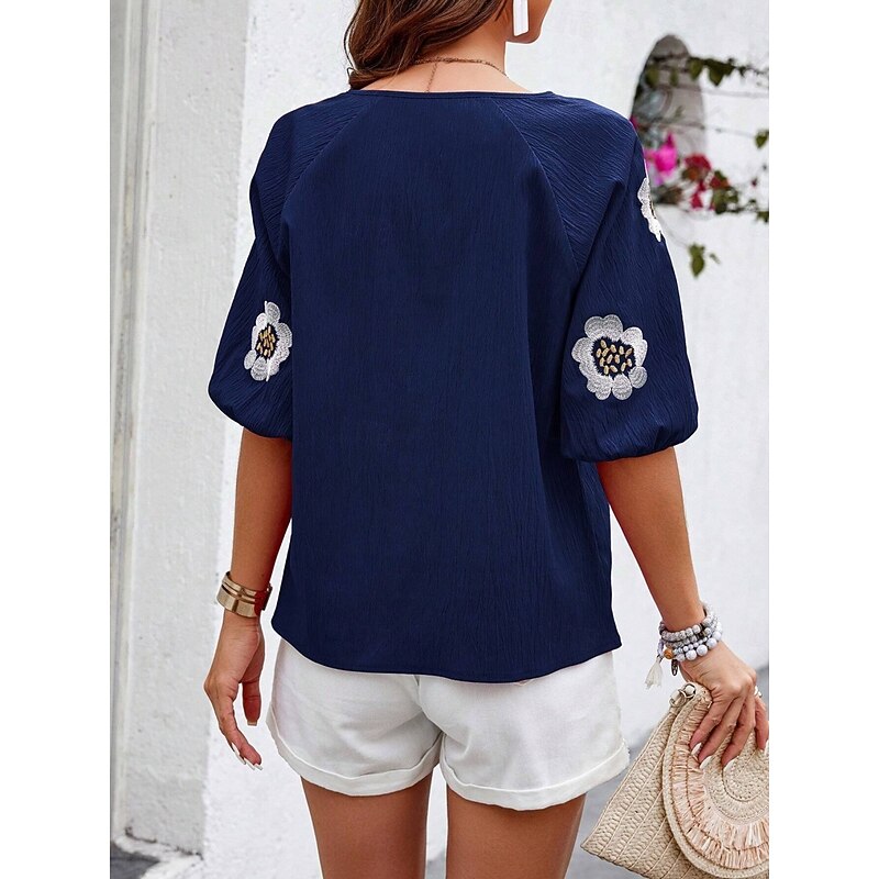 HOT ! Women's Shirt Blouse Floral Stylish Casual Short Sleeve V Neck Regular Tops Daily Lace up Embroidered White Navy Blue Summer Spring