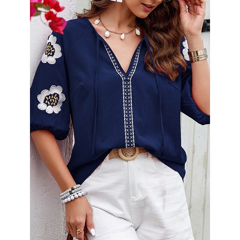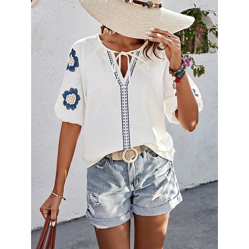 More information about Women's Shirt Blouse Floral Stylish Casual Short Sleeve V Neck Regular Tops Daily Lace up Embroidered White Navy Blue Summer Spring