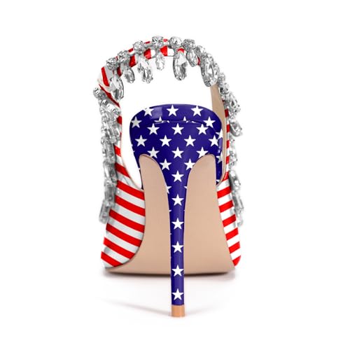 • Why You’ll Love Them: Bold Patriotic Design: Vibrant stars and stripes print in classic red, white, and blue a true tribute to American spirit. Sparkling Details: Dazzling gems and rhinestones line the edge of the vamp, catching the light with every step.
