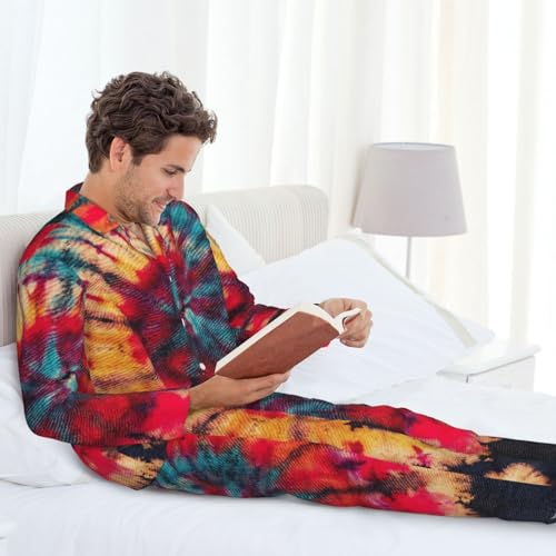 HOT ! Colorful Abstract Tie Dye Swirl Mens Pajamas Set Button Down Sleepwear Set Long Sleeve Loungewear With Pockets