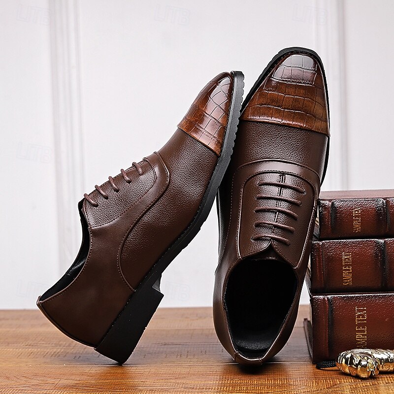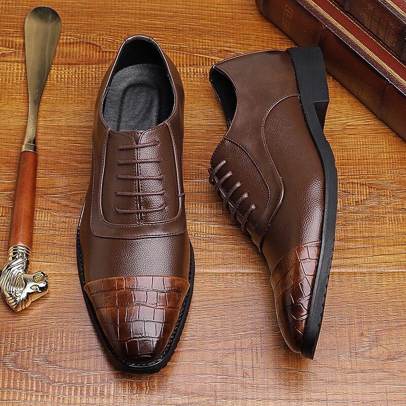 HOT ! Men's Brown Faux Leather Oxford Shoes with Crocodile-Patterned Toe Cap – Lace-Up Design, Stylish and Comfortable for Casual or Formal Occasions