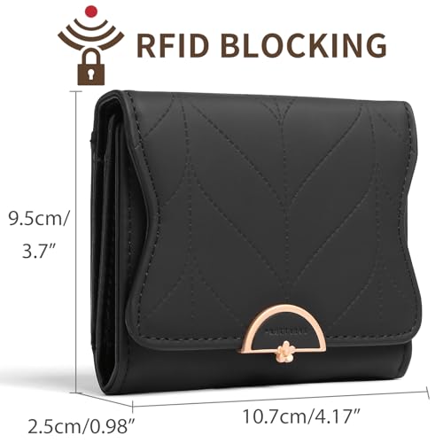 HOT ! Cute Genuine Leather Wallet for Women RFID Blocking Bifold with Zipper Coin Pocket (Black)