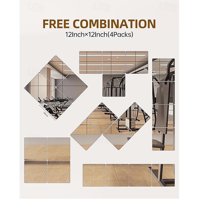 4 Pack Glass Wall Mirror Tiles 12" x 12" Frameless Full Length Mirror Wall Mounted Full Body Mirrors for Bedroom Home Gym Door Bathroom 7