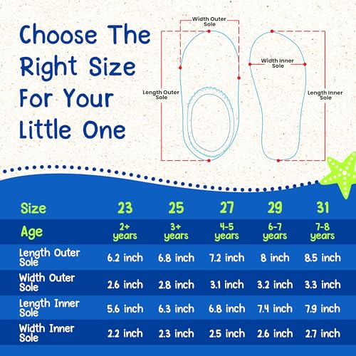 • Made to Fit - Your kid will enjoy wearing well-fitting aqua shoes that won’t slip off and float away. Our kids water shoes come with a soft hook-and-loop fastener that adjusts perfectly to your child’s feet for an exceptionally snug fit.