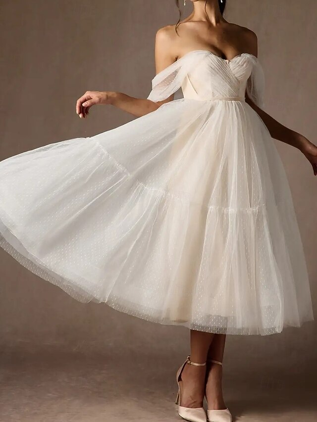 Engagement Little White Dresses Wedding Dresses A-Line Sweetheart Strapless Tea Length Satin Bridal Gowns With Sash / Ribbon Pleats 6